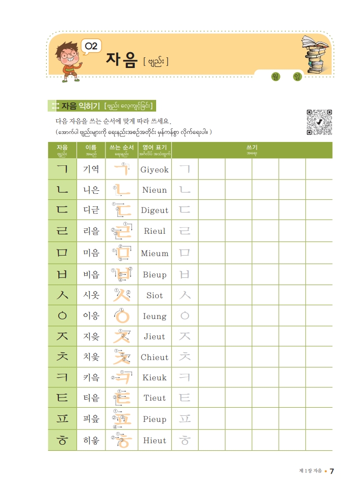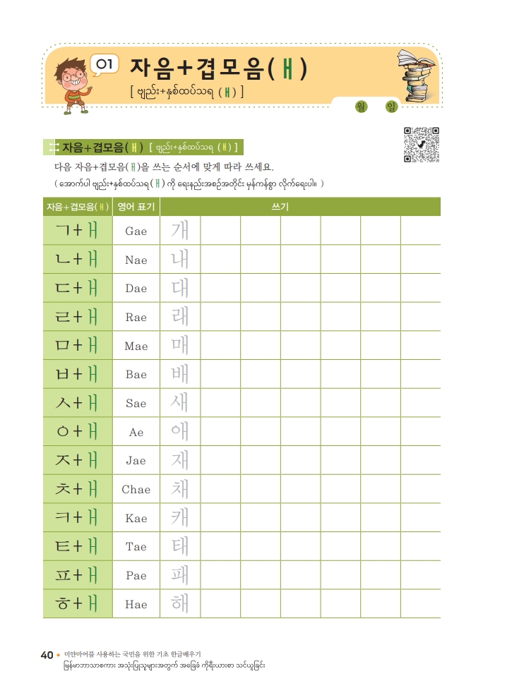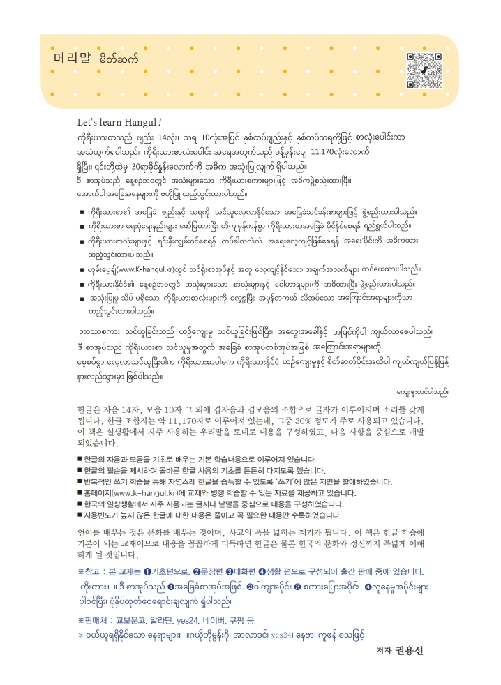 이번에 '미얀마어를 사용하는 국민을 위한 기초 한글 배우기 1호 기초편'을 위와 같이